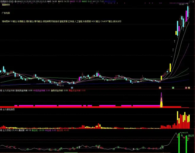 主力量能副图中上黄下红,主力洗盘,关注低位的缩量主力洗盘。这也是主力量能指标最应该关注的形态。上红下黄,主力诱多,高位的主力诱多要当心。全红趋势好,注意登顶。全黄趋势坏,注意抄底。抄底和逃顶需要结合主力顶底指标的信号。