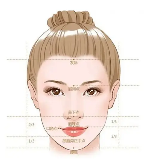 三庭指脸的长度比例,前额发际线至眉骨、眉骨至鼻底、鼻底至下颏,这三个部分大致等长,各占脸长的1/3。五眼则指脸的宽度比例,以眼睛长度为单位把脸的宽度分成五个等分,从左侧发际至右侧发际,为五只眼长的距离。
