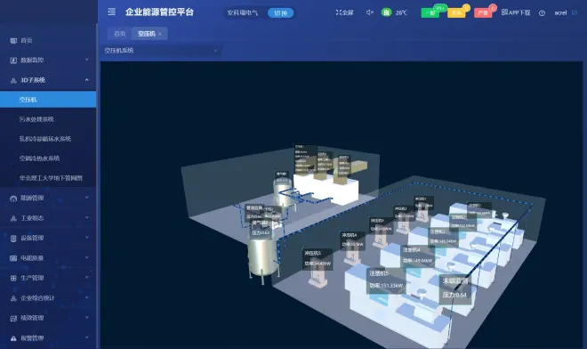 采集工厂工艺用电、厂务用电、纯水、氮气、压缩空气等消耗量,同环比对比分析,能耗总量和能耗强度计算,标煤计算和CO2排放统计趋势。