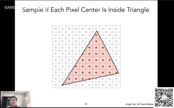 给定一个三角形,在像素的中心进行采样,来判断中心是否落在三角形内