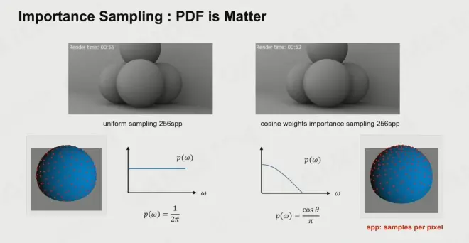 不过,我们不能抓住一个 PDF 不放,最重要的是根据需求而选择合适的 PDF。归根结底,做渲染也是一个做 Sampling 的过程,我们一定要选择合适的采样法则,这样才能更好地逼近于正确值,实现照片级渲染。