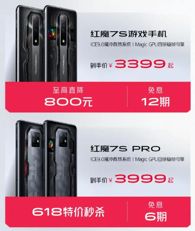 根据日前红魔官方微博发布的618优惠政策了解,此次618大促,红魔游戏手机给我们带来了诸多福利。其中,搭载第一代骁龙8+,ICE 10.0魔冷散热系统以及红魔Magic GPU自研稳帧引擎三大稳帧利器的红魔7S系列,在本次618活动中,给出了立减800元的优惠活动,并支持12期免息。这款手机唯一一点不太好的就是,它是红魔去年的一款旗舰,不是最新款,但好在整体性能在当下市场仍然是非常耐打的存在。