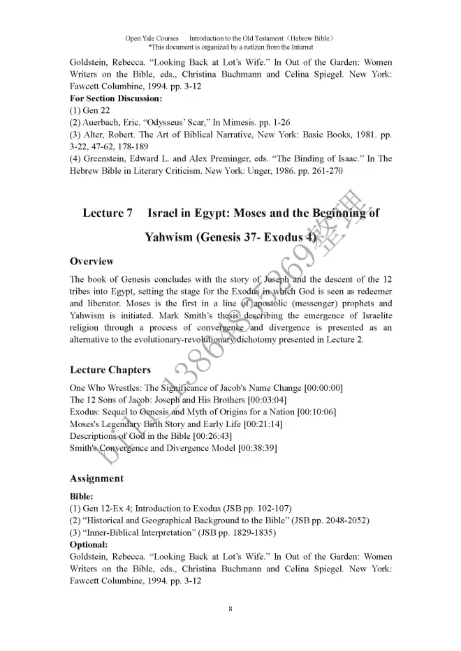 以下内容整理自耶鲁大学公开课《旧约(希伯来圣经)导论》(Introduction to the Old Testament(Hebrew Bible),该课程由Christine Hayes教授讲授,全课程共24讲(不含考试部分)。课程目录(中文翻译)和课程内容(含课程简介、教学大纲、每讲概述等内容)整理如下: