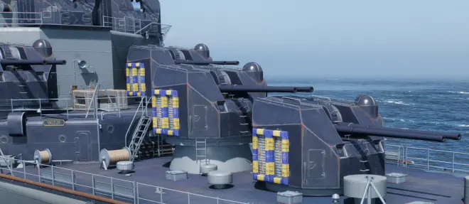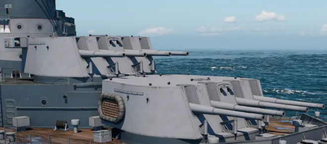 顺带一提乌沙科夫上也是这种类型的副炮,但是炮座是BL-132B型炮座,区别在于中部的雷达系统圆罩被移除了。