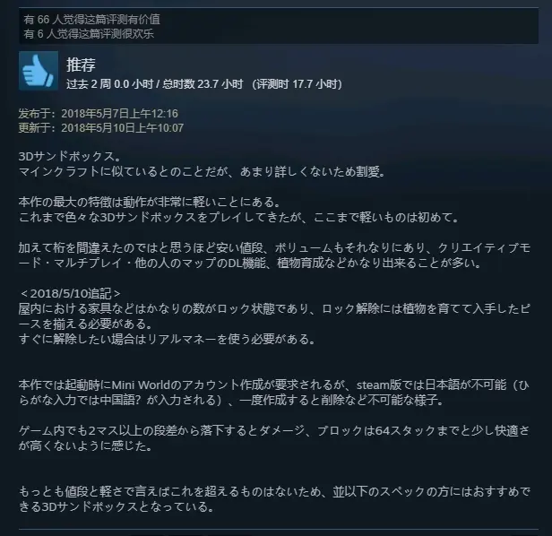 游戏中很多东西都是锁定状态,需要培养和收集才能解锁。游戏启动时需要创建mini账号,但是Steam不支持日语。游戏中如果从2格以上的高度掉下来会受伤。 不过整体来说,没有比这个更好的了,非常推荐的一款3D沙盒游戏。