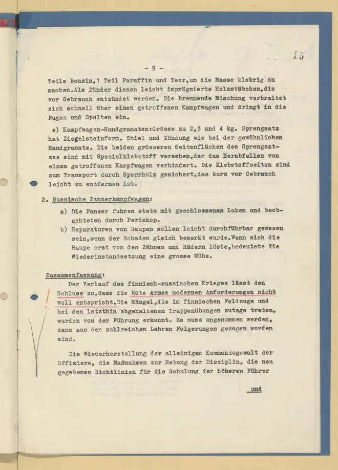 从芬兰-俄国战争的过程中我们得出的结论是红军并不完全符合现代化的要求。其高层已经认识到军队在芬兰战役和最近举行的部队演习中所暴露出的缺陷。我们必须认为,在大量的教训之后红军已经总结出一些结论。