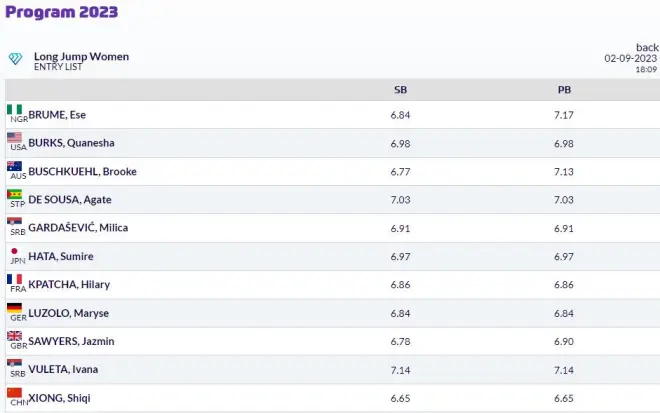 女子跳远:世锦赛冠军武莱塔、布鲁姆、布什库尔 、伯克斯、德索萨、秦澄美铃、索耶斯、加尔达塞维奇以及全国锦标赛冠军19岁的熊诗麒等