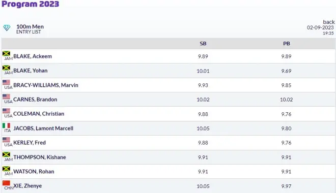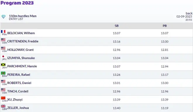 男子110米栏:世锦赛前五名霍洛维、帕切门特、罗伯茨、克里滕登、泉谷骏介和第八名贝洛希安、 尤金世锦赛第五名泽勒、今年跑出世界第二好成绩的科德尔·丁奇、亚锦赛亚军徐卓一还有南美冠军佩雷拉 。