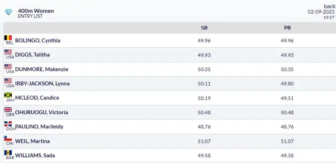 女子400米栏:世锦赛季军克莱顿、世锦赛第五名科克雷尔 、世锦赛第八名奈特、世锦赛第七名拉塞尔等