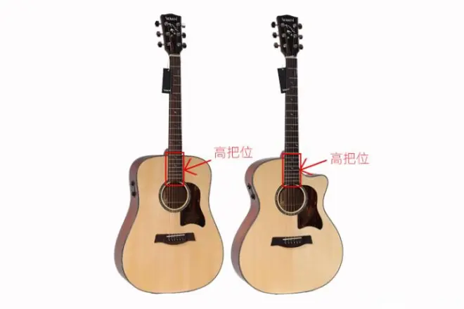 从外观上可以直观看到,两者之间最大区别就是缺角吉他在共鸣箱体上相比于圆角吉他有一个小缺口的设计,这是为了更好看吗还是其中有什么奥妙?其实都不是的,原因是因为圆角吉他在高把位上,也就是靠近音孔位置的品位,在演奏中受到一定限制,这才有了缺角吉他的设计,缺角吉他与圆角吉他功能上最主要的区别就是缺角吉他方便演奏高把位而圆角吉他在高把位的演奏相对困难。