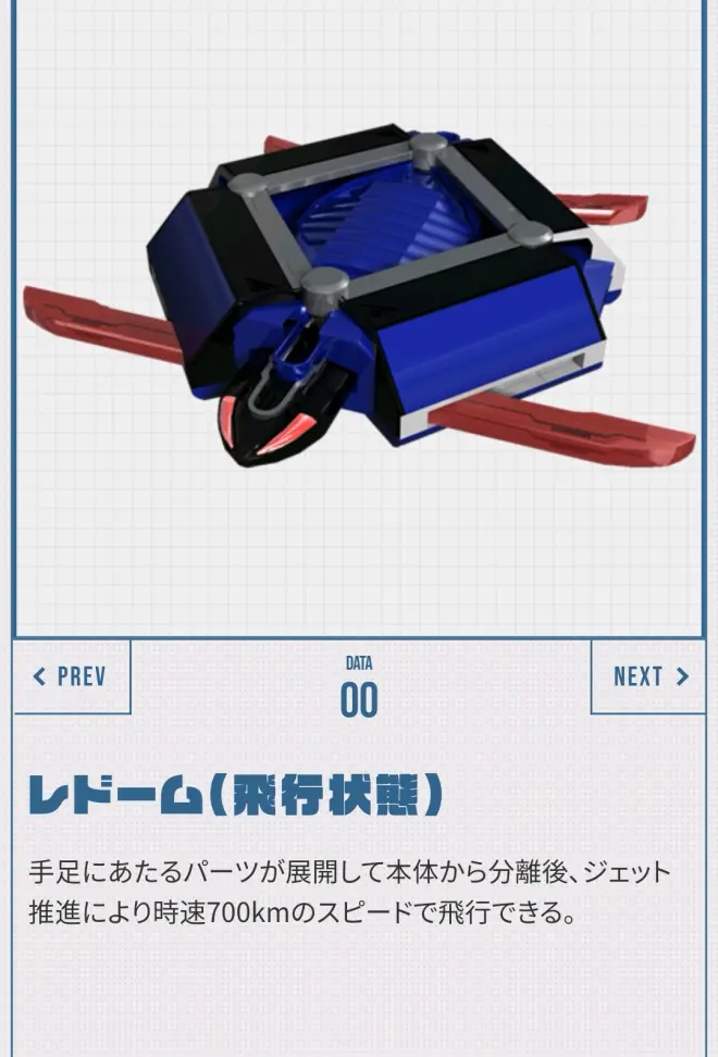通过使车辆后部所具备的“Radome”上升,使之展开后变形为战斗形态。从前部鳍状的零件把自由能源变成必杀的武器光线发射。