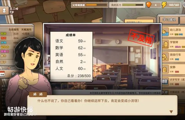 所以《中国式家长》它的意义就在于用一款游戏来让你学会换位思考,从孩子呱呱坠地开始,你就要不断为他做出抉择和安排,去点亮不同的属性,去平衡孩子的自由和压力。在有限的精力、金钱、经验下,做出取舍和妥协。