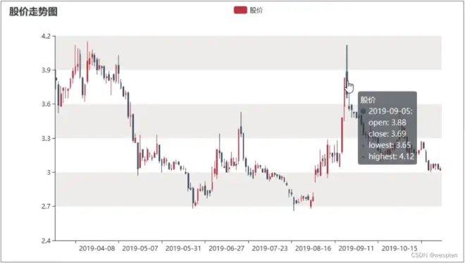 K线图用于反映股价信息,又称蜡烛图、股价图。所有的K线图都是围绕开盘价、收盘价、最低价和最高价这4个数据展开的。使用pyecharts模块中的Kline()函数可以绘制K线图