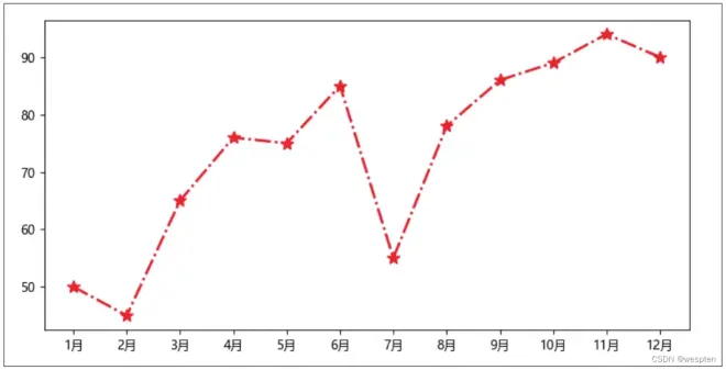 代码中的marker= '*'表示设置数据标记的样式为五角星,markersize=10表示设置数据标记的大小为10点。