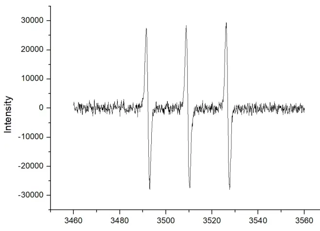 如图7所示左边,单线态氧简称1O2,有3个峰,从左往右,3个等高,1:1:1。有时,如图7所示右边,由于溶液受阻,最后一个峰会比前2个低些。
