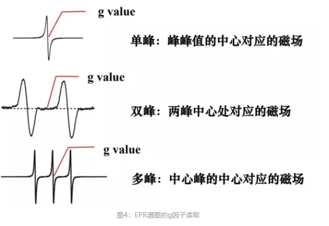 如图4所示,单峰的g因子是峰与峰的中心点对应的磁场,双峰的g因子是两峰中心处对应的磁场,对称的多峰的g因子是中心峰的中心对应的磁场。