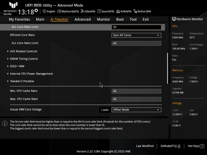 B760是不能超U的,所以即使对13900K来说,P核最大就是55 E核最大就是43 RING最大就是45.