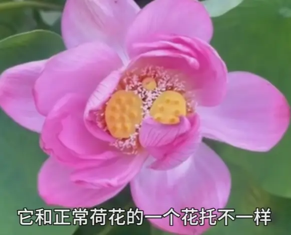 并雌莲乍看和普通荷花没什么不同,但是它和正常荷花的一个花托不一样,它有两个花托,如下图所示,其发生概率更低,有人说是百万分之一。(并雌莲和并蒂莲有什么区别?)
