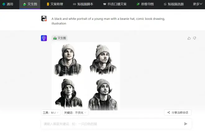 比如输入生成男人的黑白肖像: A black and white portrait of a young man with a beanie hat, comic book drawing, illustration