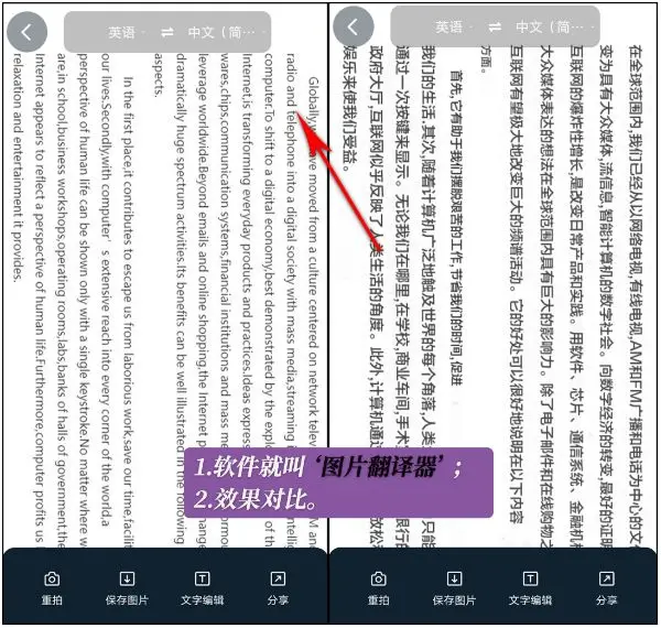 当我们拍摄一张包含文字的照片时,软件通过OCR技术将图片中的文字提取出来,然后使用机器翻译算法将文字翻译成目标语言,如英语翻译成中文。这一过程通常能够在几秒钟内完成,因此非常迅速和方便。