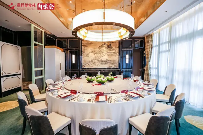江南灶·云府,位于南京香格里拉酒店42层。碧色丝绒大门精致华丽,古典字画随处可见。整体空间以清代诗人刘风浩《个园记》中所描绘的“园、文、宴”三位一体为蓝本,以玉色为贵,以竹色为韵。低头是接天莲叶花纹的地毯,抬头则是波光浩渺图案吊顶,回首可见以传统织锦工艺绘制的太湖石鸟挂画,春风吹荡玄武湖,所见皆为艺术。