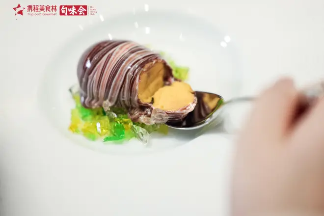 春日探访金陵,比带走一块雨花石更有趣的应该就是吃进嘴里了吧。江南灶云府本次旬味会的甜品环节,是一道中餐西做的甜品慕斯。选用巧克力外衣包裹住山芋奶油,再填入燕窝和少许清新的薄荷,清凉微甜,奶香浓郁,十足的清新雅致,不知不觉间,在品尝者的舌尖下起了一场江南春雨。