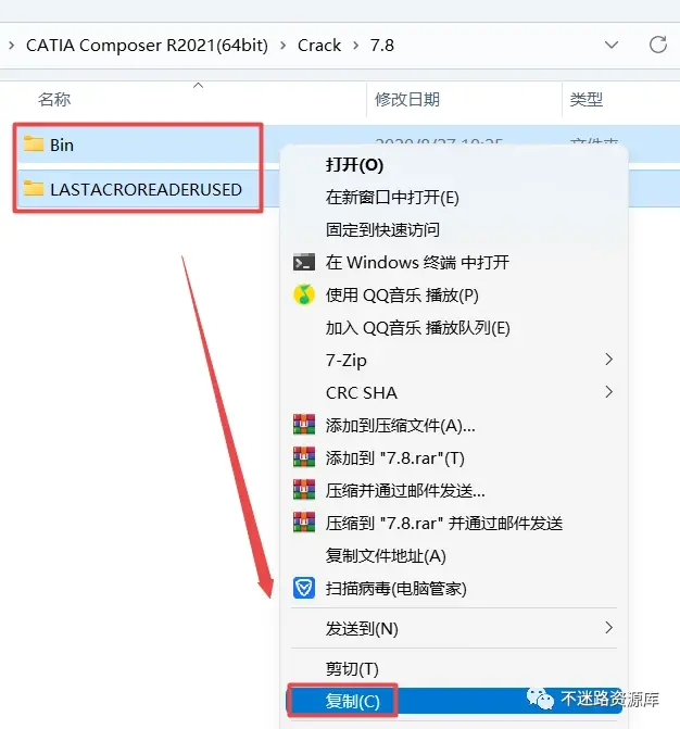 16.返回之前解压的“CATIA Composer R2021(64bit)”文件夹,依次打开“crack——7.8”文件夹,复制该文件夹里面的两个文件夹