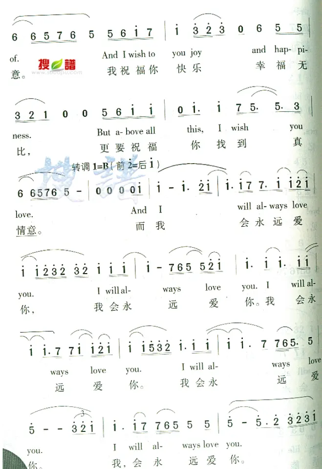 【《保镖》主题曲】I Will Always Love You--Whitney Houston演唱--简谱