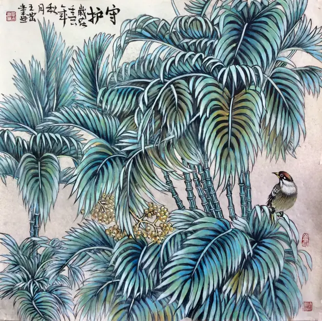 王岗画的中国花鸟画成功之处在于他感悟大自然生活中得到的艺术语言,在感动中创作出这样明丽而丰富的色彩画,他立足于中国画传统,同时也注重西画技法与彩色的应用,多元化的包容,也是他在中国花鸟画独有的特点之一。他善于运用明亮的色彩来描绘植物和花朵的美丽,鸟类的灵动,使得画面充满生命力和活力,同时,他巧妙地使用传统水墨与彩色相互结合来表达自然界的平和与宁静。通过运用丰富多彩的色彩,他的作品给人一种愉悦和欢乐的感觉。