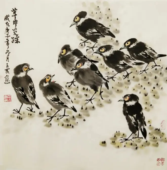 王岗的花鸟画作品不仅在水墨和色彩细节上令人称赞。还展示了他对构图章法和形式的独特理解。他的花鸟画构图严紧,通过精心的布局和画面对比,使得整个作品更加生动和引人入胜。同时他的作品也具有一定抽象和写意性,通过夸张提练来表达对他对花鸟画独特理解和感受,这种独特的构图和形式赋予了他的作品独特的艺术氛围。