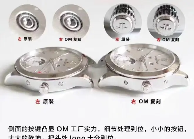 ▼ 整体对比 :OM工厂这款积家各个功能的排列位置均显见于银色太阳饰纹表盘,井然有序,优雅隽永,功能全同步,整体和原装基本一致,难辨雌雄。