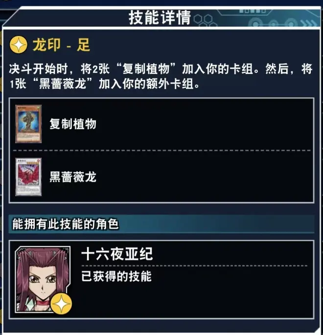 「决斗链接」手游中,秋的专属技能「龙印-足」是在决斗开始时可以把「黑蔷薇龙」和「复制植物」一起投入卡组。