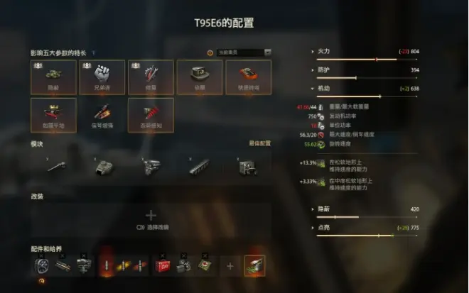 本来T95E6的机动水平是十分拉跨的,不过自从WG将其发动机的马力从560匹加强至750匹,T95E6的机动瞬间就好很多了,就算是不上涡轮,也有18的单位功率和56.3的极速,虽然算不上多优秀吧,好歹的跟上了十级MT的平均水平了,转场什么的也都够用。