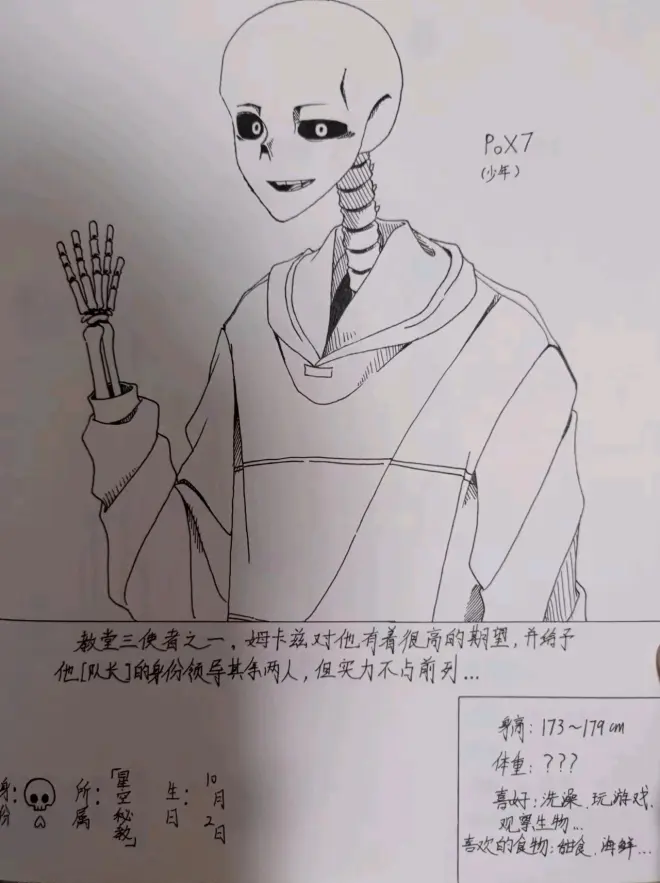 ) 我将它发布到了网易的《我的世界》的玩家评论区里,(当时的《我的世界》真的好怀念啊…………只是现在不在了。。。)一共吸引了二三十个人,其中来了一个评论,大致内容我已经记不清了,但是他说我画的很好,叫我继续加油。 后来,我在学校里,认识了一个同桌,他平常很不起眼,直到那一天,他打翻了我的文具盒之后,我对他起哄,他胆怯的说了一句对不起之后,看到了我画的Sans,眼里突然闪出了点光,他小声地和我说:“你也知道传说之下?哇.....这个Sans……很好看…………” 我便来了兴趣,我回应了他,没想到他对于这一类竟然变得像:突然找到了话题的“电灯泡”一般对我说各种各样的AU,他跟我说,在这一部游戏里,有很多的不同创作作品(其实就是同人)有叫做ink sans!的,有叫做尘埃的,有叫error的……当他见到我画中的原衫旁,有一个穿着类似于自己学校的校服的Sans时,他便和我说“你也想要创造一个你自己的AU吗?” 我愣住了,看着眼前我自己“自创”的Sans,一时半会儿不知怎么应答....他很识趣,便不再继续追问了,从那一天开始,我便和他成为了无话不谈的朋友,他也幻想着能拥有自己的一个AU,或者是能在他人的AU里拥有自己的设定,尽管我没有学过画画,但是长久以来的“自学成才”让我成为了班级里唯一一个会画画的学生,这也让他能有一个自己设定,或者是成为他人AU里也有独自的人设拥有了一丝希望,于是,我便像着了迷似的,疯狂的创作着我自己的“骨设” 后来的事…………长话短说,从一开始的骨头三人组(PoX7、??、??) 到2019的年底的确立三人组(PoX7、雷、KF)和星空秘教俩兄妹(哥尼•姆卡兹、哥尼•布奇•茵) 再到2022年的坠尸死地(死神•塔纳托斯、Hank、涅) 再到2023年初的80%的新增角色和老角色的确立完善———— [星空秘教]的:基斯特里、梅、哈姆雷特 [坠尸死地]的:赫诺亚尔、赫诺伊雅 每一个角色的创作都花费了我好大的精力……他们的人物故事、人物关系,我用了整整3年之久………… 而这里面的有一些人物在现实中是有本人的,比如说我就是PoX7,我的那一个好朋友是[雷•托斯克],另外还有一个这三年来认识的一个要好的兄弟,是[KF•摩尔]还有非常佩服我的一个朋友是[基斯特里] 这一路走来…………光是这三年时间……也不过就创建了这几个角色而已…………我的一个朋友推荐我把我的这些设定发布到网上……可是我不喜欢抖音的那种氛围……于是我第一时间,便想起了