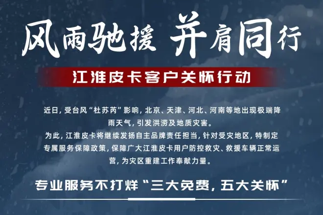 所有江淮皮卡销售服务网点将根据实际情况,向车主提供避灾场所、安心餐食等服务。