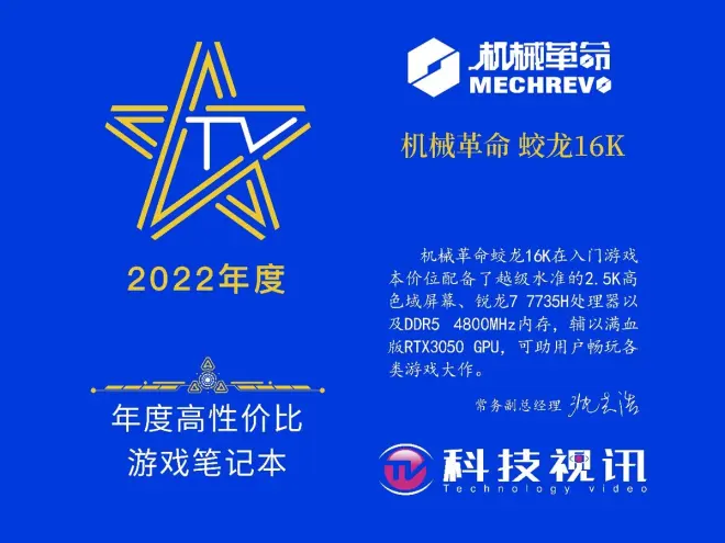 机械革命蛟龙16K在入门游戏本价位配备了越级水准的2.5K高色域屏幕、锐龙7 7735H处理器以及DDR5 4800MHz内存,辅以满血版RTX 4050 GPU,可助用户畅玩各类游戏大作。从基础硬件到外围配置,蛟龙16都可谓是同价位中颇具诚意,也令人心动的一款产品。因此在本年度的评选盛典中,机械革命蛟龙16K被科技视讯编辑部一致评选为“年度高性价比游戏笔记本”奖项。