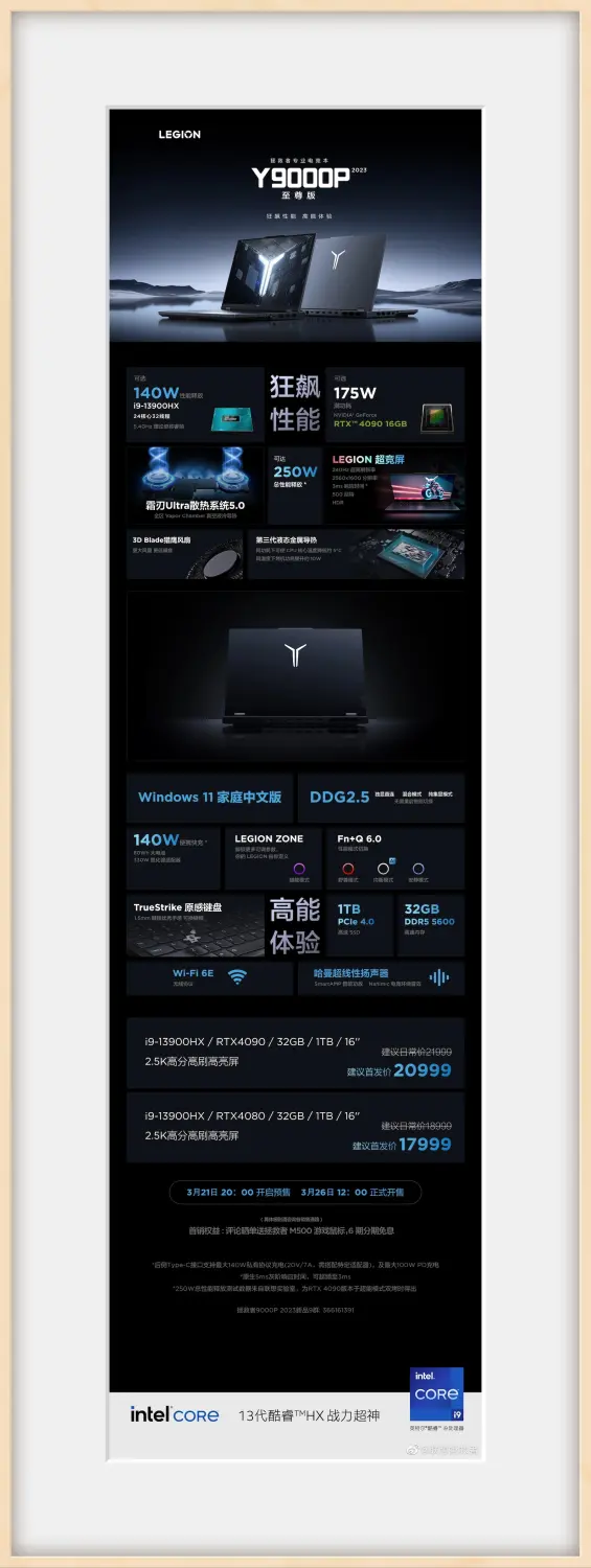 IT之家 3 月 21 日消息,联想今日发布 2023 款拯救者 Y9000P 和 Y9000P 至尊版游戏本,首发售价如下: