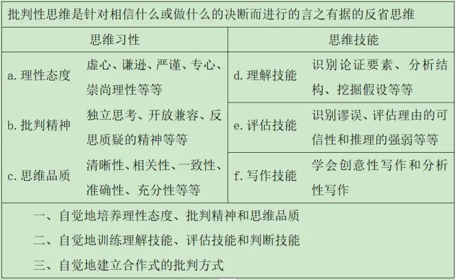 批判性思维是清除错觉、识破欺骗、破除迷信、澄清误解、做出好的判断、迈向成功人生的工具;批判性思维是教育的使命;批判性思维是树立科学发展观,建设理性和民主社会的工具。