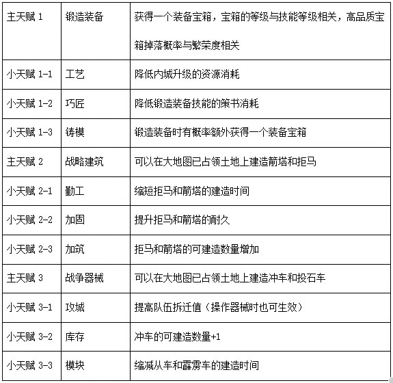 天工的三个职业天赋技能分别为:锻造装备、战略建筑和战争器械,具体如下表所示: