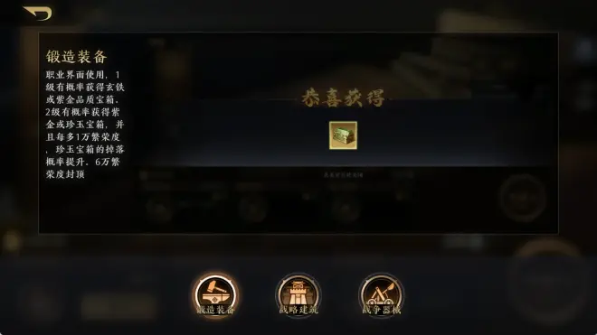 锻造装备系天赋虽然可以锻造装备,但在前期技能点不足尤其是繁荣度不够时,获得高品质装备宝箱的概率较低,如果在前期投入天赋点则收益较低,待到中后期繁荣度提高、技能点充沛的情况下点出,能够获得高品质装备宝箱的概率更大,收益更高。