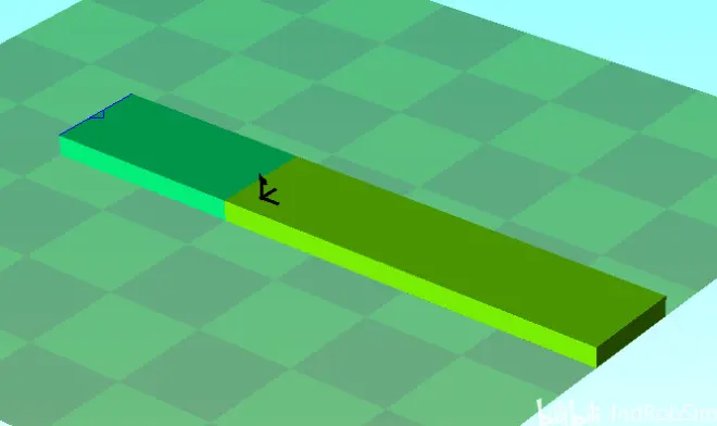 软件虚拟仿真环境中出现简易输送带模型,如下图所示,其中深绿与浅绿相间的是简易输送带台面,蓝色的箭头是输送带的移动标记,深绿与浅绿的分界线位置是输送带的原点位置,箭头所在的位置是输送带的输送起始点位置,箭头所指方向就是工件输送的正方向。