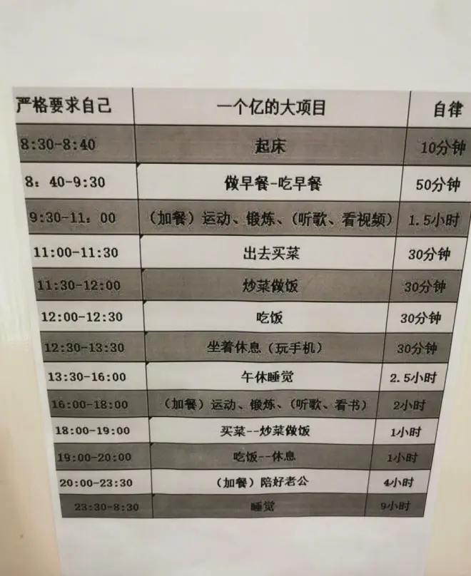 近日,流传于某书平台的一份“老公安排的孕期任务”突然火了起来。尚在怀孕初期的刘女士被要求每天出去买菜做饭、洗衣打扫,定时定点地看书、运动、听歌。