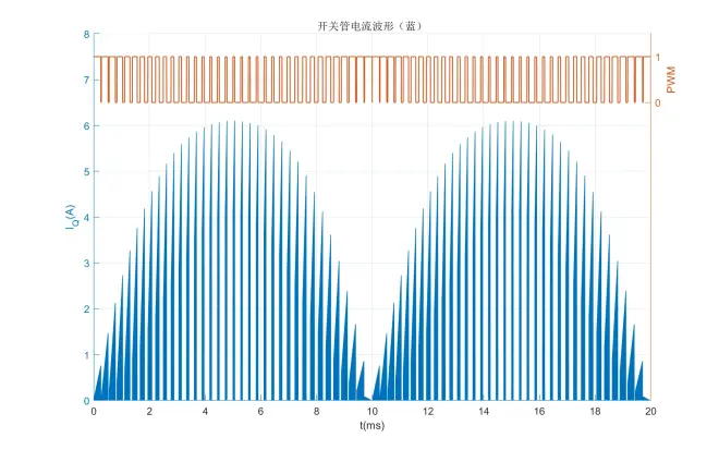 为了让读者直观感受交流分量波形,对开关频率fsw进行了低于实际频率的夸张处理。若以真实的开关频率绘制(仅绘制半个正弦周期),其电感电流波形为: