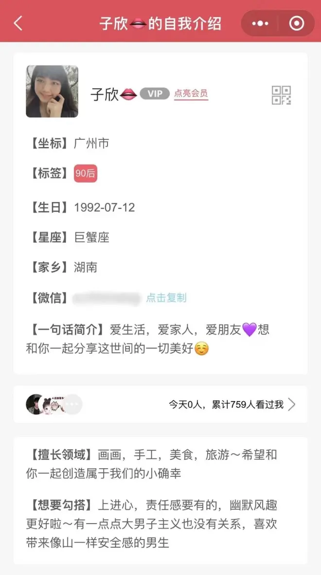发了一段时间的朋友圈,我开始去加人,在某个相亲群里发了「子欣」的交友链接,我曾经在这个群里发过自己的真实资料,是短发实拍照片,「子欣」则是长发美颜照片,群里几乎没有男性察觉到这是同一个人。加我的人渐渐多了起来,速度比「黄引」快多了。「成功率」也非常高,大部分都是在微信上没聊几句就提出要跟我见面,见了面就希望可以迅速确定关系。