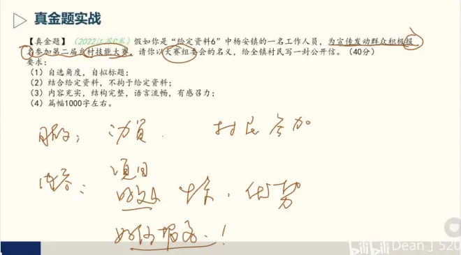 老师多次提到不熟悉的公文,大家要掌握通用公文格式:标题+称呼+正文+落款。具体为①正文内容包括:开头+主体+结尾,分三段;②开头介绍背景、问题、目的;③结尾简单总结、呼吁动员;④正文:按行文目的整理要点,形成中心句+拓展表达形式。大师兄提到的“帽子”写法很受用,既增加了精练性,又让阅卷老师一目了然。而今天做的公文是宣传类的,即说服别人做某事,语言具有煽动性,对策后面有号召。针对这些题型,自己会强化练习与总结。