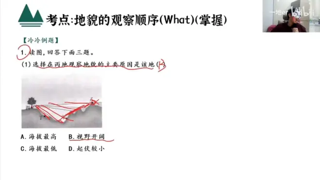 - 这道题在视频开头其实提到过,视野开阔最适合观察,就是那个一哥和冷冷的例子