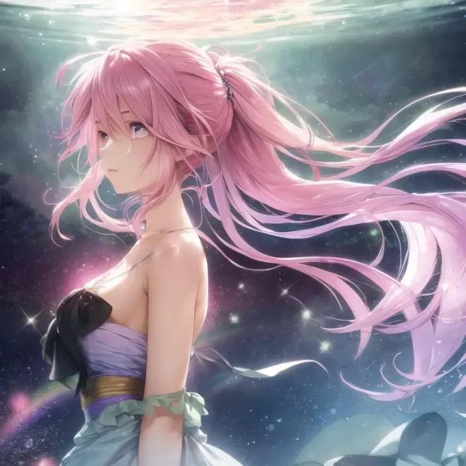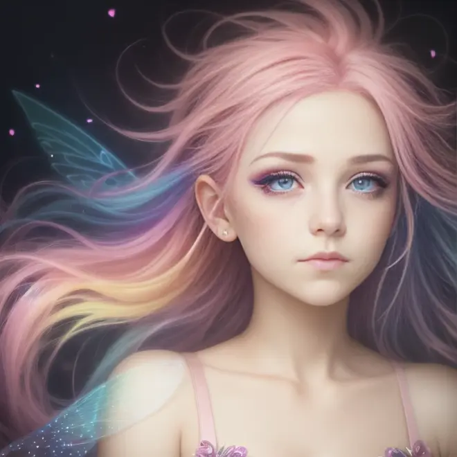 With pink hair and rainbow eyes,beautiful as a fairy,A melancholy expression that stirs affection,side face,floating hair,light particles,glare,vivid,fancy,dreamlike,a dim atomshpere,