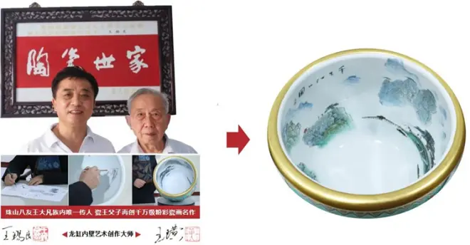 九龙缸外壁以周国桢大师绝技“松石釉金彩高浮雕”创作,这是历史上少见的“五层通体金彩高浮雕”!王锡良大师将自己最得意的粉彩山水瓷板画《千里江山》署名移至《祥瑞中华九龙缸》内壁,使其成为历史上独一无二的“内外双修”宫廷大龙缸!