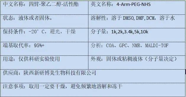 四臂聚乙二醇(4-ARM-PEG-NHS)可以用来修饰蛋白质、多肽和其他带有活性基团的材料。