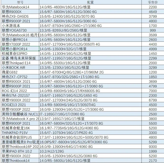» 6月份二手笔记本历史成交价格(部分仅供参考)